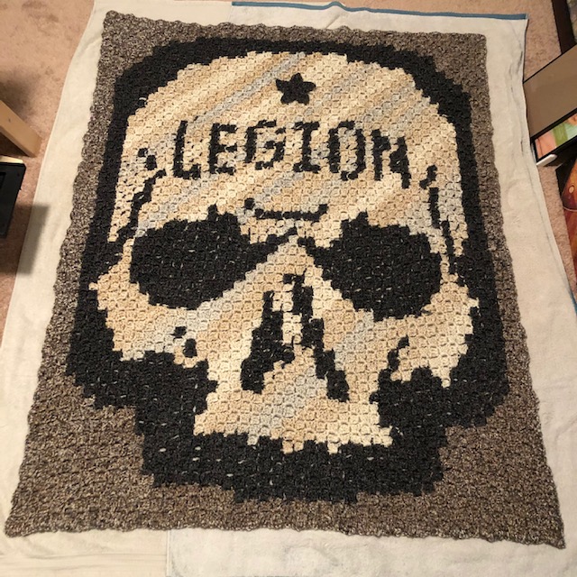 If you’re interested in which yarn I used, it was Lion Brand Homespun Yarn in the colors Shaker (brown), Edwardian (black), and Pearls (white/cream). The Pearls was my absolute favorite: the subtle variegation turned out fabulous for the skull and worked out so well for this project. Shaker has a variegation, too, but it’s even more subtle. It really blends in, and you have to be paying attention to notice it. I think I was half way through the blanket before I even caught it.