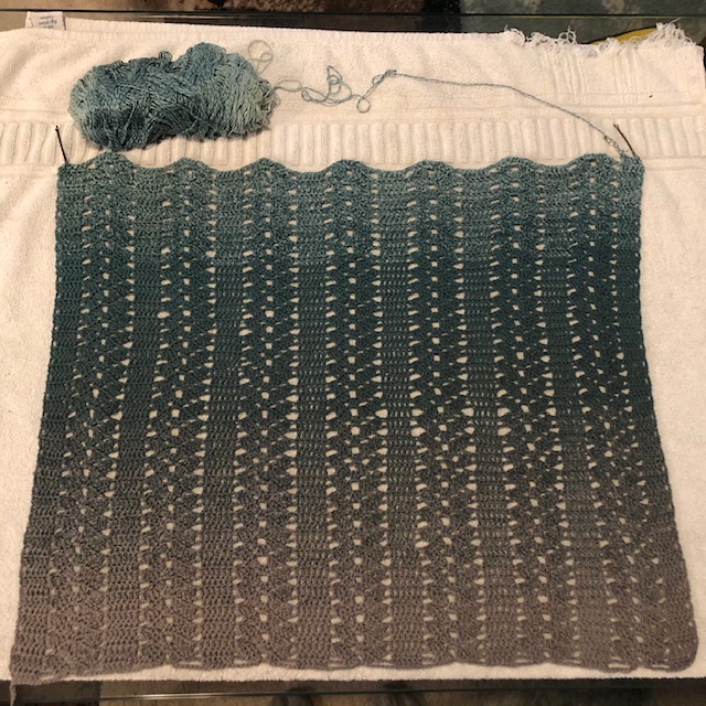 I just love the gradient of this yarn. It blends so gradually! I cannot tell you how excited I am to finish this top. I decided to make the back panel first so that I would ensure the gradient is in the right place on the front. Conveniently, it needs to be about as long as the towel I’ve been laying it out on.