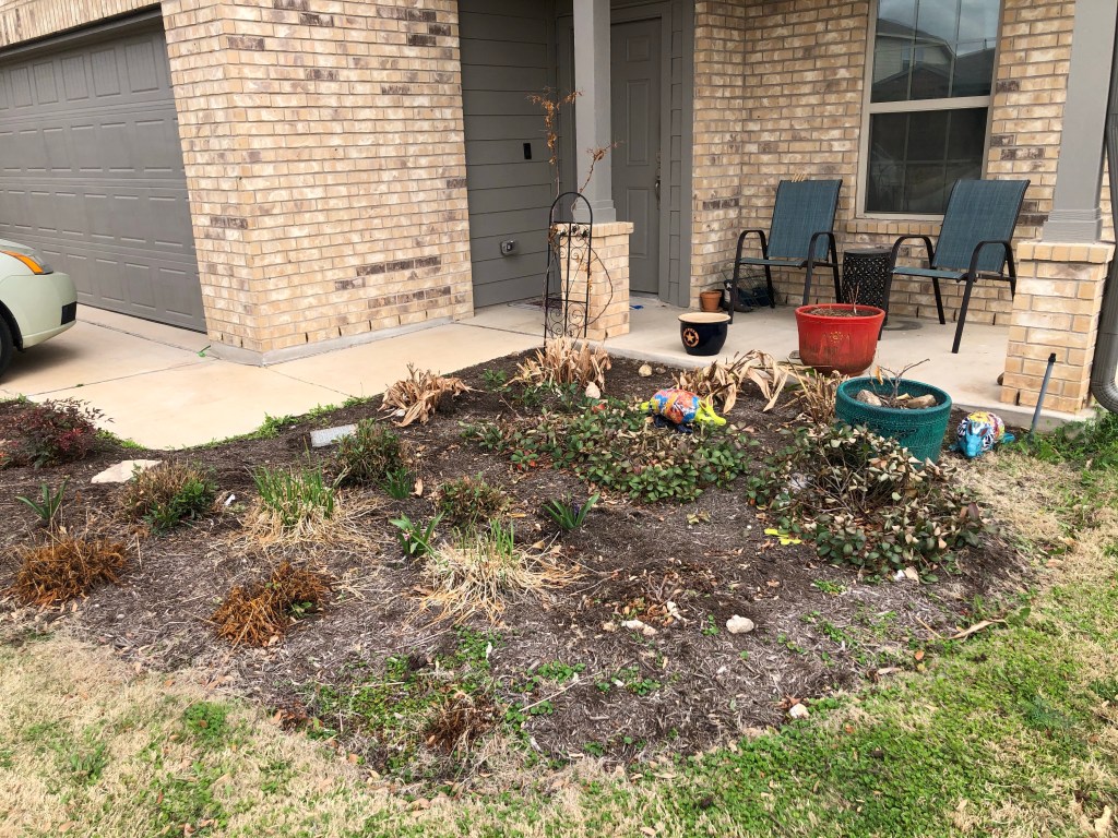 We finally gave the front bed a haircut this week. I tried not to cry and celebrated the new growth we found. The society garlic is doing well. The gingers all have new growth, even if they are struggling. The geranium has new growth. The gauras and penstemon are all doing well. I’m still holding out hope for the bougainvillea. I think the lime tree and bulbines are gone, though. I have a crepe myrtle yearling in the back yard I can move to the blue pot to replace the lime tree. We’re not sure what to do about the three large bushes between the gingers and gaura.