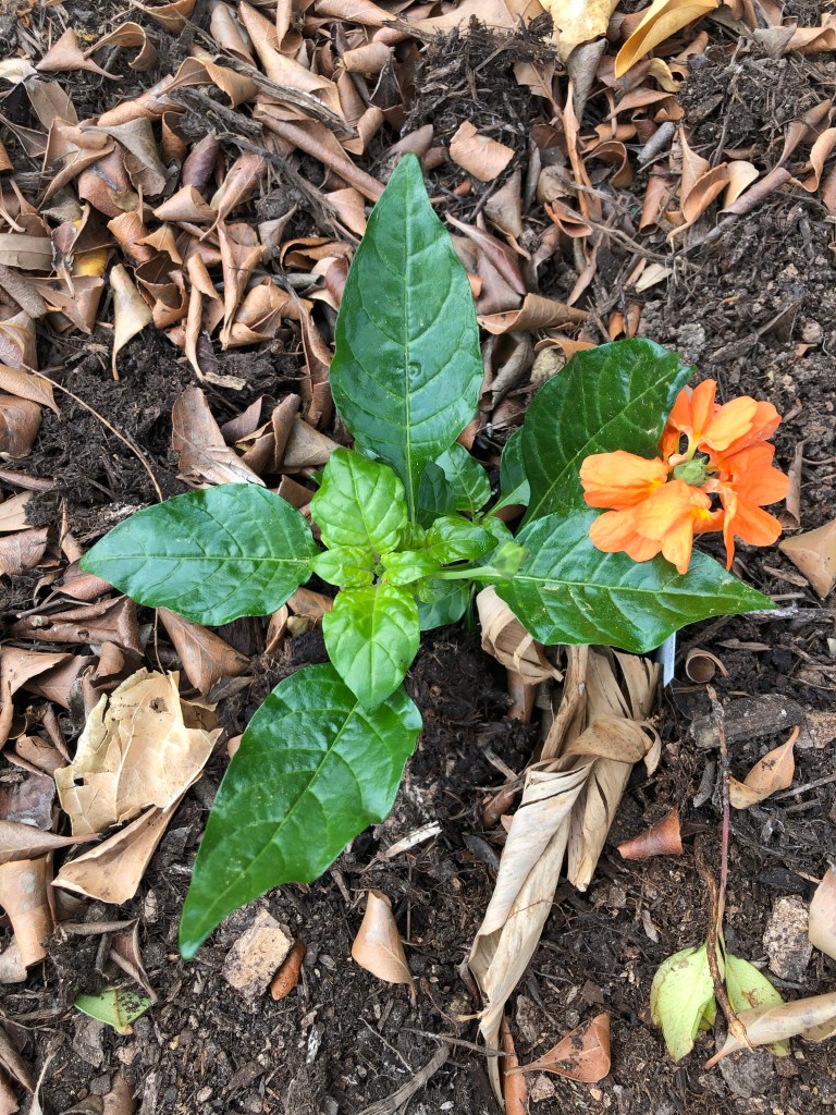 In the main bed by the house, we took out the three big bushes in front of the gingers. They were still alive, but needed such a strong haircut they looked really ugly. We never liked them anyway, so we replaced them with two Crossandra and moved one of the Society Garlics that kept getting stepped on when we took the truck.