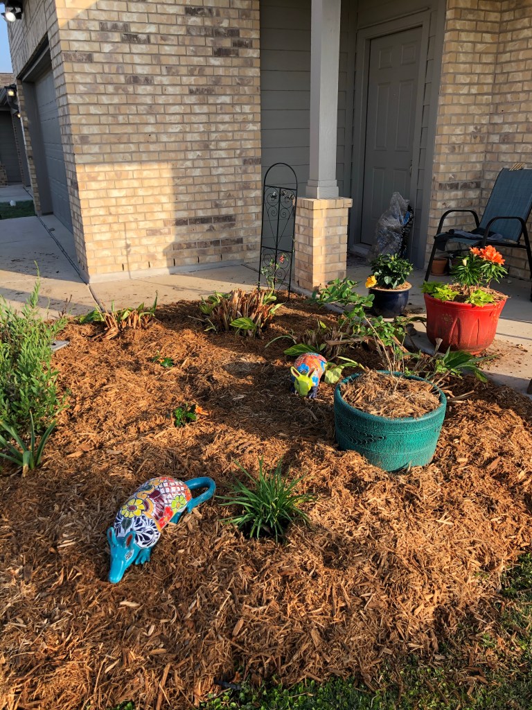 We took the bougainvillea out only to realize the roots still looked healthy. So we moved it to a pot to try to nurse it back to health. I’m still keeping my fingers crossed. I had dug up a shoot from one of the honeysuckles in the back to put in its place. That is doing very well and has lots of new growth already.