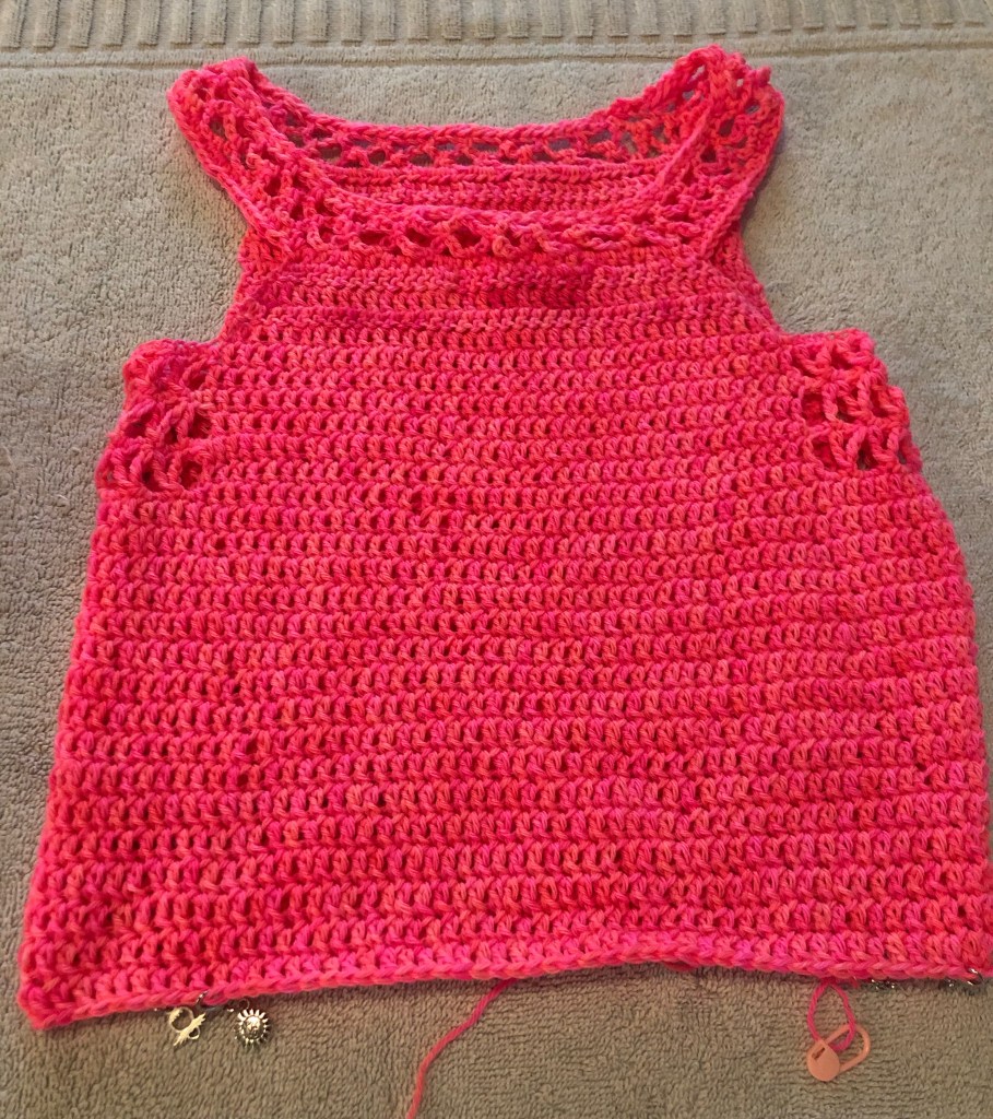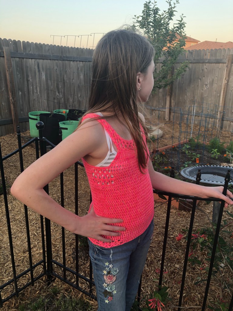 Last night she came in and asked if I’d ever finished that top I started making for her. No, no I did not. So I pulled it out, and we took a look at it. She tried it on and decided she wouldn’t notice the wonky seam. So I quickly finished the last two rows. And it looks fabulous!