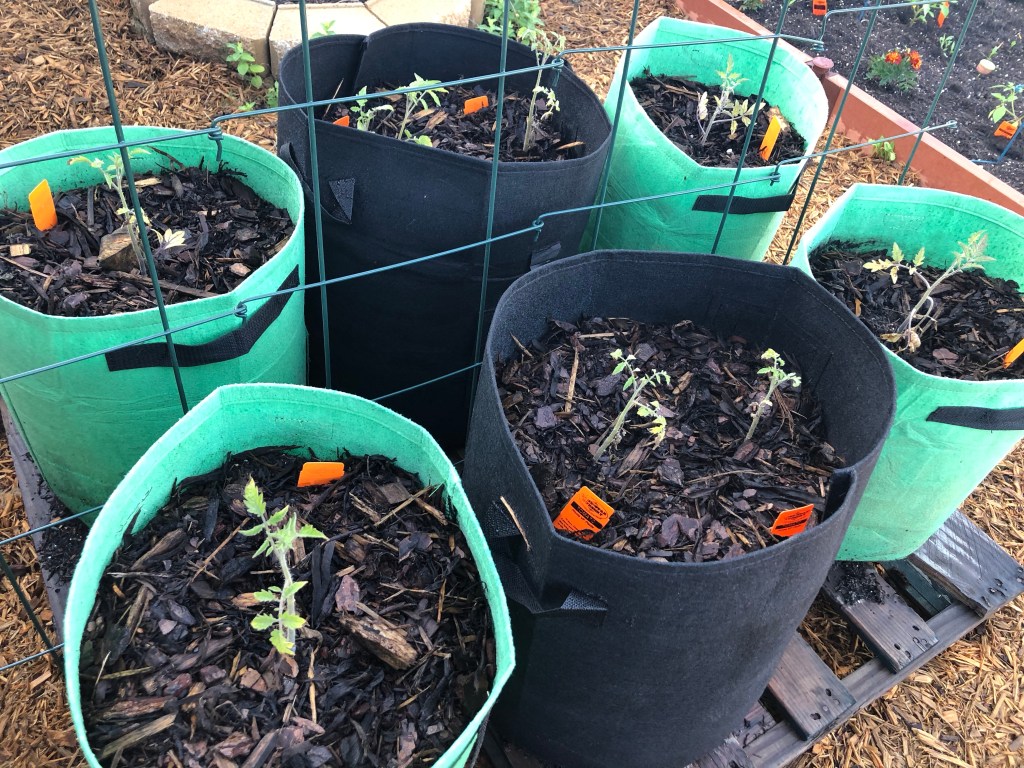The tomatoes in the grow bags in the other side of the yard aren’t doing as well. I have lots of theories. They’re San Marzanos, which can be a bit more finicky. Because they’re in bags and not the ground, they’ve been much more susceptible to the colder nights we’ve had since I planted them. And they also dry out faster in the bags. I need to pay more attention to them.