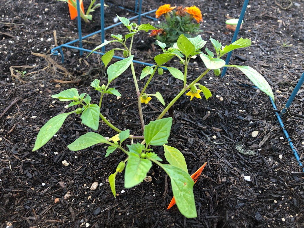 The tomatillos are doing well. Even though they were only three inches tall, they were producing flowers, which I had been pinching off. However, I thought maybe that was why I hadn’t been getting any fruit last year, so I stopped pinching and started letting them flower now that they’re six inches tall. This guy here had a mishap one night this week: something nearly severed the stem at the soil. It was hanging on by a thread. It was my strongest plant, so holding back my tears, I straightened it out and built the soil up around it. And forgot to water it. That bed stays pretty damp anyway, so it didn’t seem to mind because the plant has bounced back almost like nothing happened.