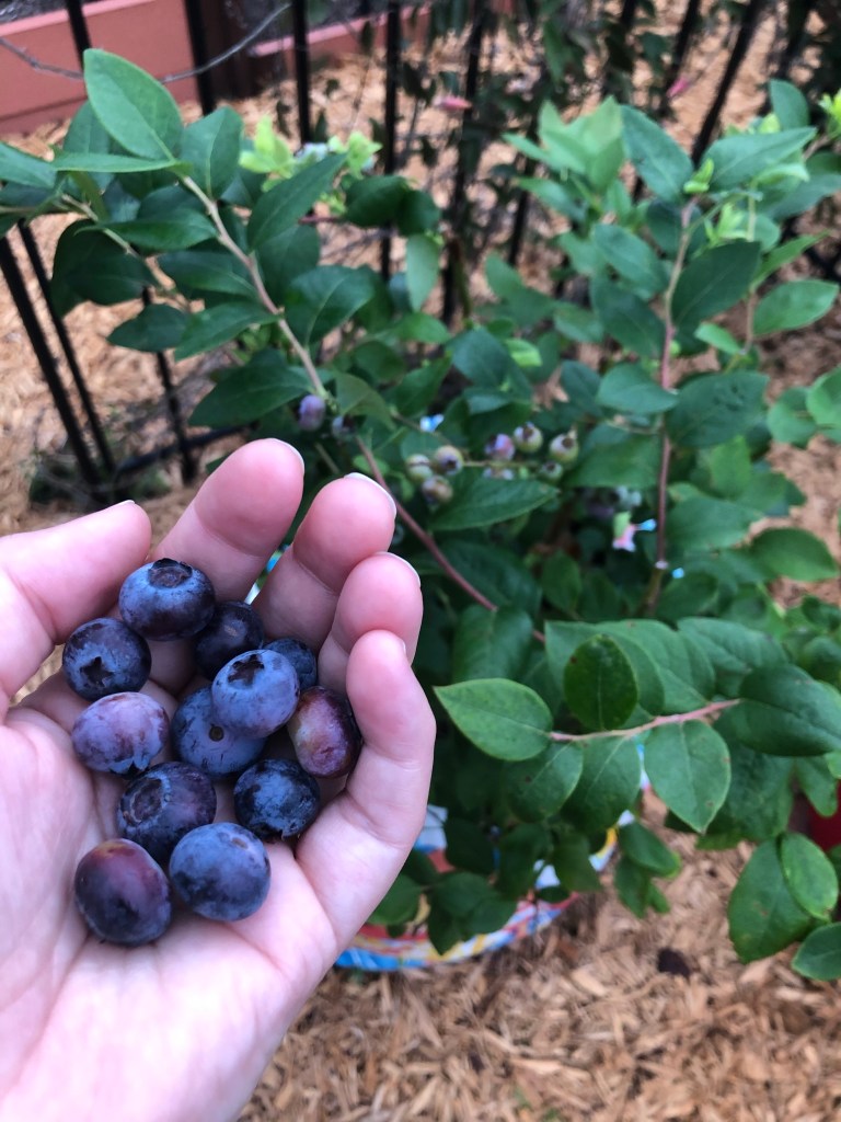 Speaking of blueberries, a couple of the bushes had berries on them when we bought them, and they’ve been ripening. So far we like the Emerald blueberries best. They are so sweet!