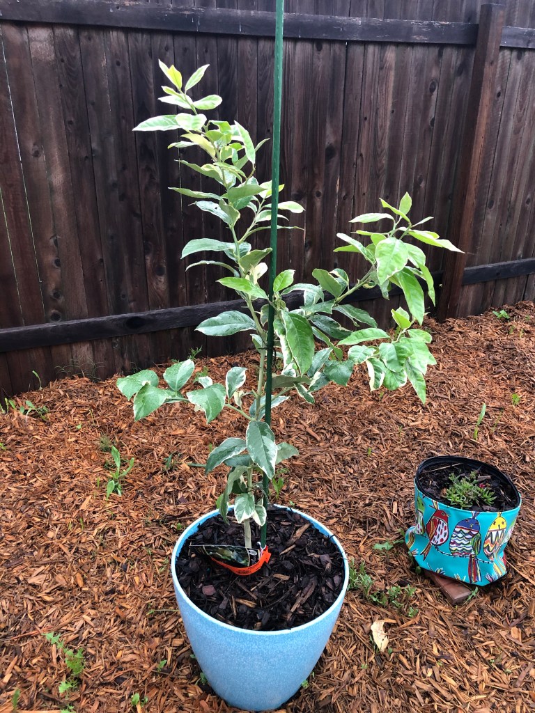 I really think this lemon tree has grown six inches since we put the stakes in a couple weeks ago. I’m going to have to tie it up again. None of the other trees have grown as much, except maybe the blueberries, which are bushes, and the apples, which are older and in the ground.