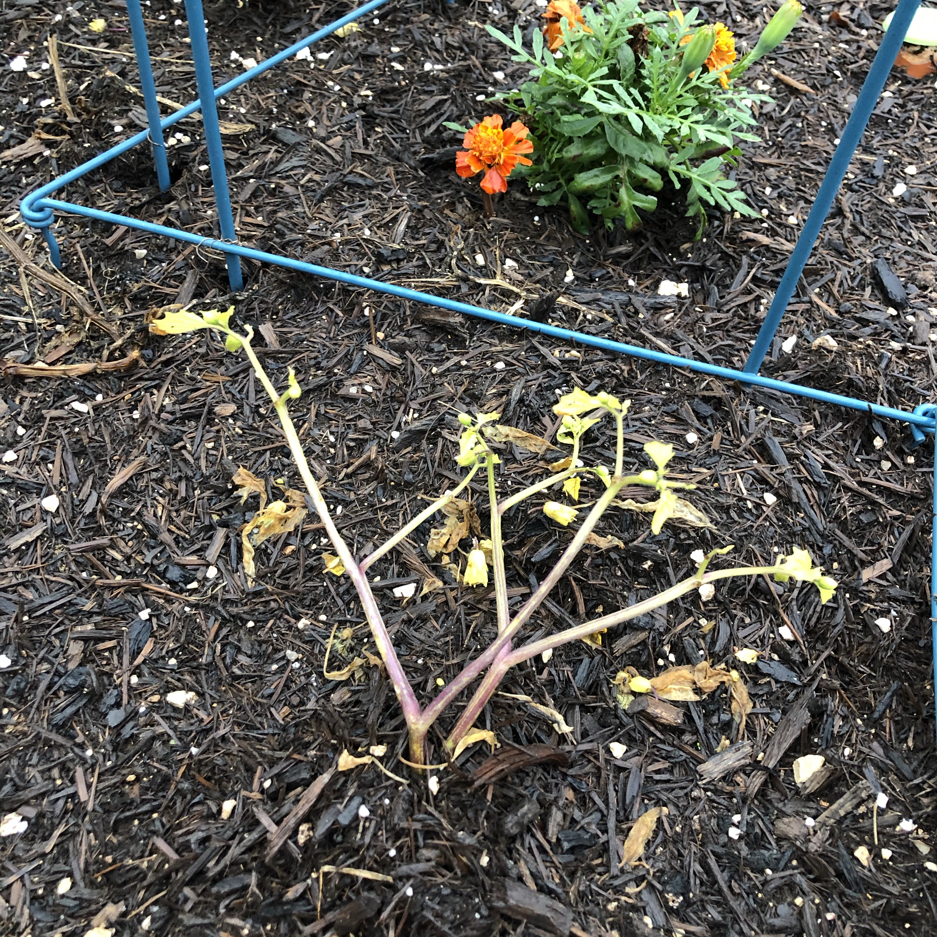 Speaking of dying, remember that tomatillo I was so excited about last week? A few hours after I published the post, it fell over and died. Just flat and wilty, no life. Ugh. I pushed some dirt up around its stem. Maybe it had some good roots that would grow? Then it rained. The thing is perking back up again. It really can’t decide if it’s alive or dead. The rest of the bed looks tremendous though. I wish the bees would leave the front yard and come start pollinating the back yard!