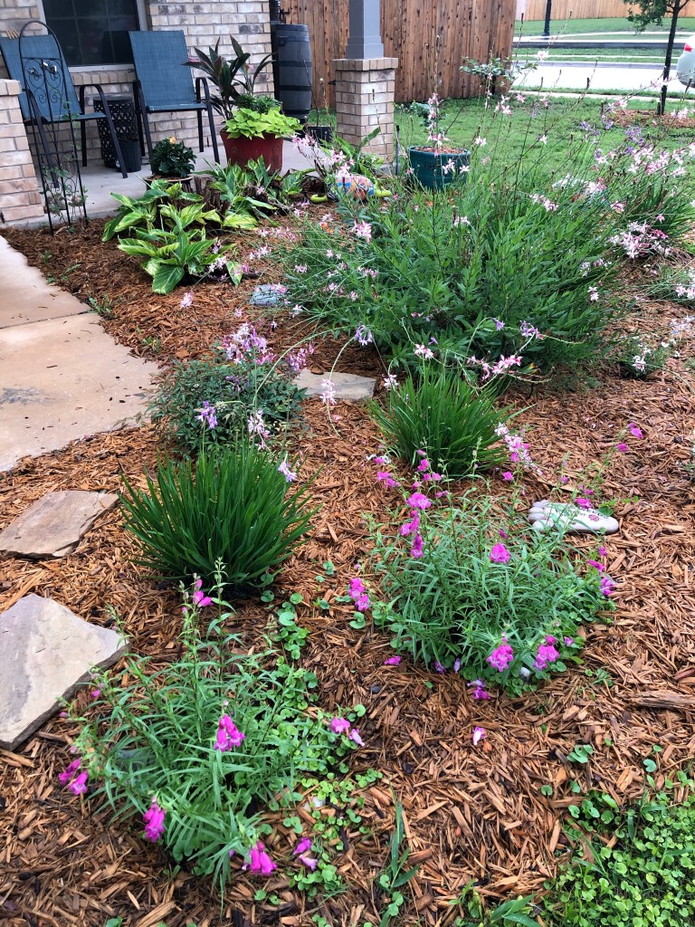 The front yard really does look fabulous though. I can see why the bees like hanging out up there. Nearly everything in this photo was cut back to the ground in February after the freeze. I am so pleased with how it has recovered.