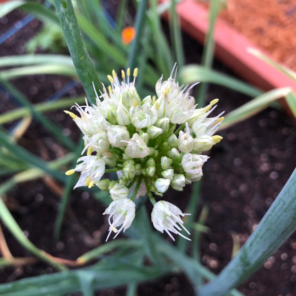 With the herbs, we already had mint, rosemary, two types of thyme, and two varieties of oregano. We added a stevia plant and two parsley plants to fill in where we cut out the Swiss chard. We put dill and fennel in the anchor pots on the trellis. We have five other basil plants in addition to the plethora of holy basil. We added two roselle hibiscus plants for making tea. We put these in pots this time to help them through the winters. I started garlic in the fall, but I fear it might be lost to mold. Its lower leaves are starting to brown, so I’ll be pulling it soon. The green onions I planted look like full onions, so I’m curious what those bulbs look like! They’re flowering beautifully!