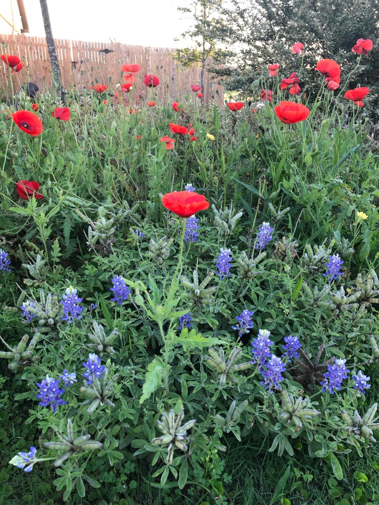 The front is looking great! Mostly. The bluebonnets have started popping their seeds, but also had some late blooms this week, so they’re also in the “indecisive” category. I’ll probably be pulling a lot of them this week. This photo is from earlier in the week.