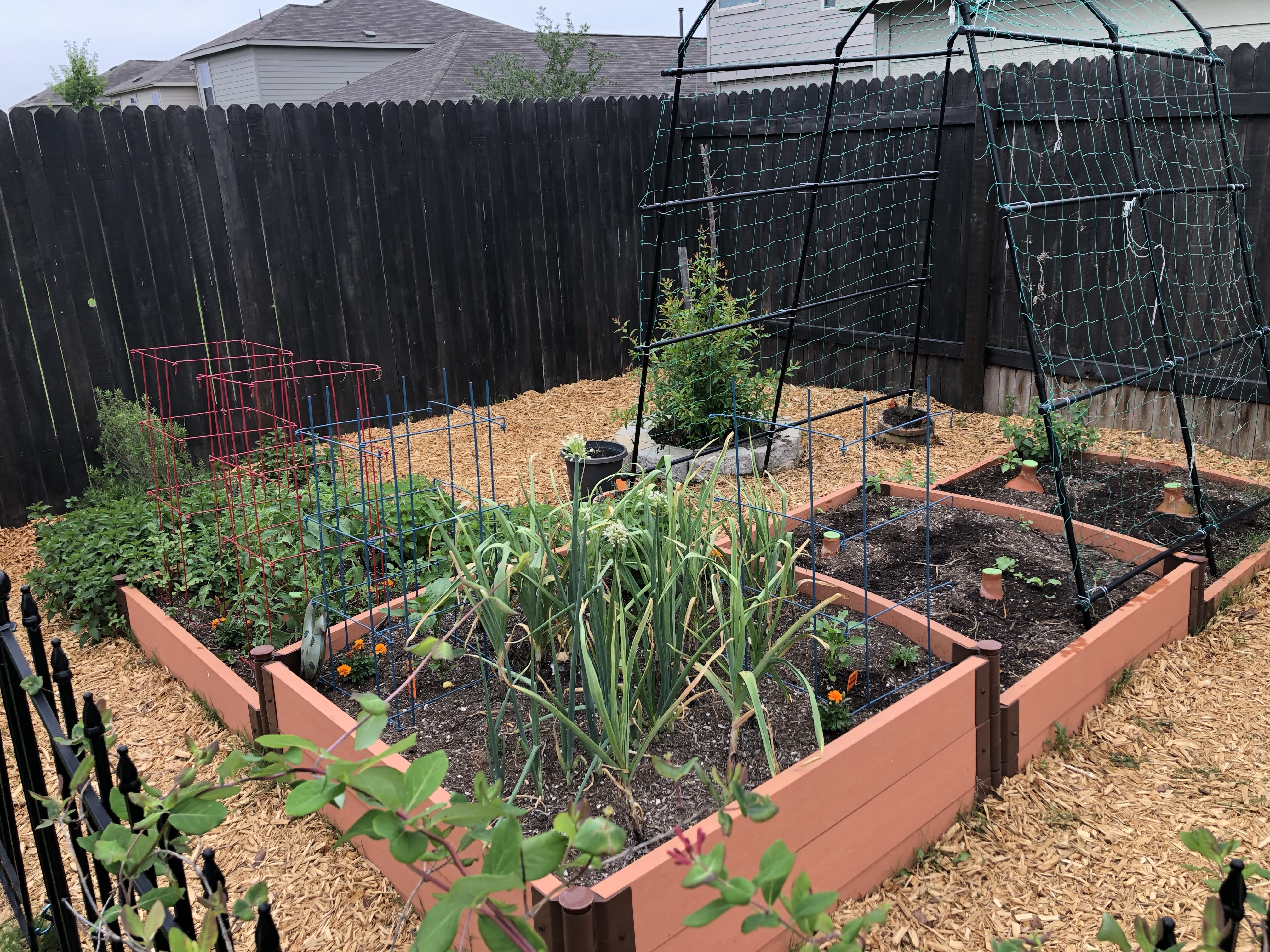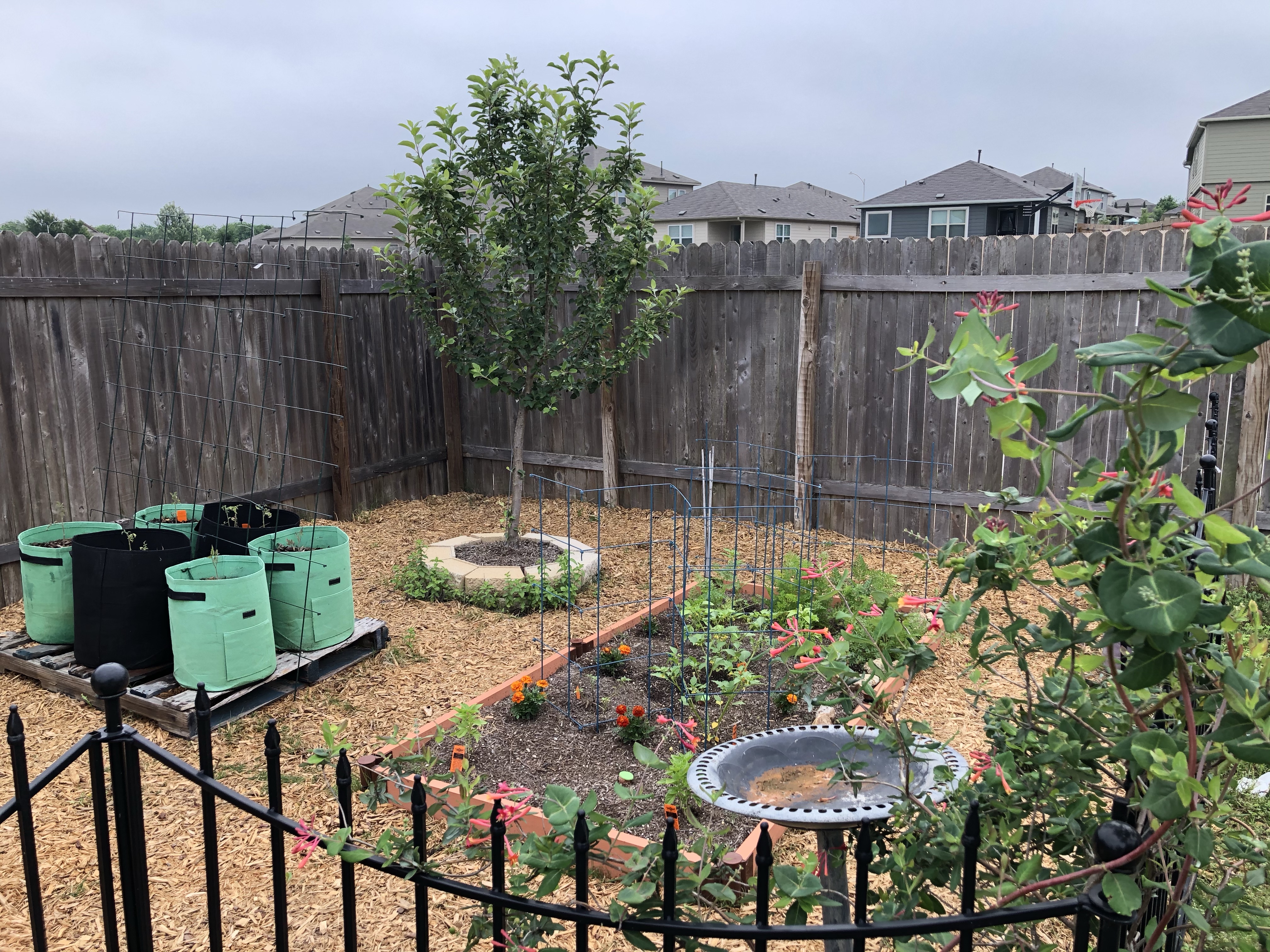 I think I’m finally done building my Spring garden. This week we added five peppers, two melons, two hibiscus, and a half dozen herbs. Oh. My chard never came up, or I didn’t plant it and thought I did, so I do need to reseed that. So I guess I’m not completely done. We do love our Swiss chard. So here is the current view of our back garden.