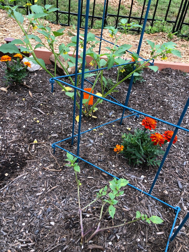 I put my muskmelons on the trellis this year. Hopefully they won’t be affected by the dreaded SVB. I also bought two tigger melons and put them out on the black fence to grow. This might be the last year for this packet of seeds of the muskmelons. I saved them from a melon I bought at farmer’s market back in 2014. It is hands-down the best melon ever. I saved seeds last year because I thought I was probably pushing my limit. They’ve been slow to germinate, but far I’m at 7 out of 10 from the 2014 seeds. That’s a way better success rate than the store-bought sunflower seeds, zinnias, and amaranth I planted with them! I’ve only had two sunflowers and three amaranth come up, and no zinnias.