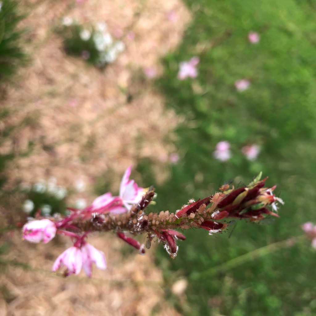 I’ve noticed a serious aphid infestation on the gaura though. I’ve been torn between letting them stay to tempt the beneficial bugs to the yard (we need more!), and they are in the front yard after all, but oh my goodness, I do mean it is an infestation! I finally took a bucket of soapy water out and cut some of the stems off. I saved the ladybugs and lacewings I saw, but I’m sure I missed some. The aphids were moving on to the winged stage, and I don’t need them discovering the back yard!