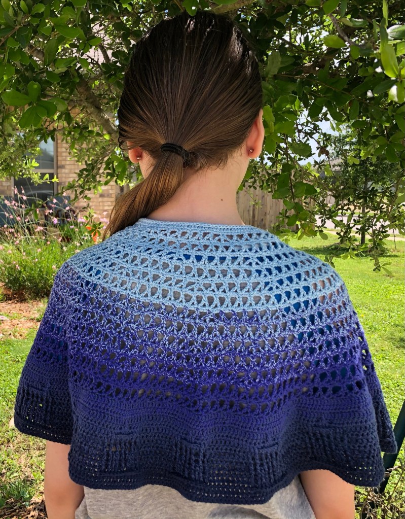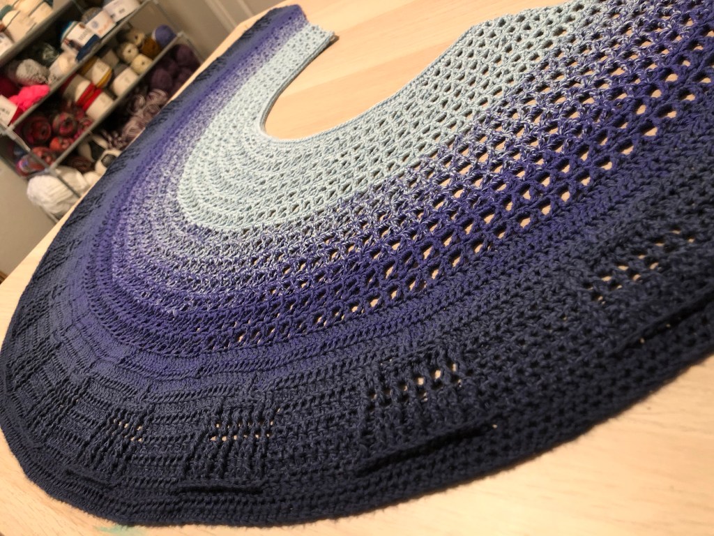 So many thanks to Kate Atherley for the original knitted project, “It’s Bigger on the Inside” shawl, and her kind encouragement as I worked through a modified crochet version.